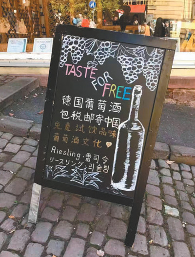 德國法蘭克福,當?shù)仄咸丫粕掏瞥隽酥形膹V告牌。記者 李強攝