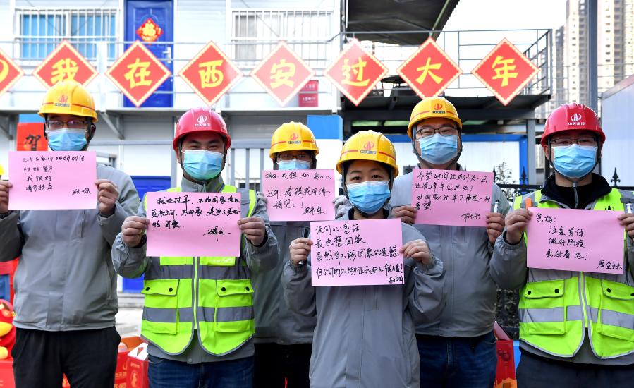 2月1日,在西安中天西北集團(tuán)一住房項(xiàng)目建設(shè)工地,建設(shè)者寫下自己想對(duì)家人說的話。新華社記者 劉瀟 攝