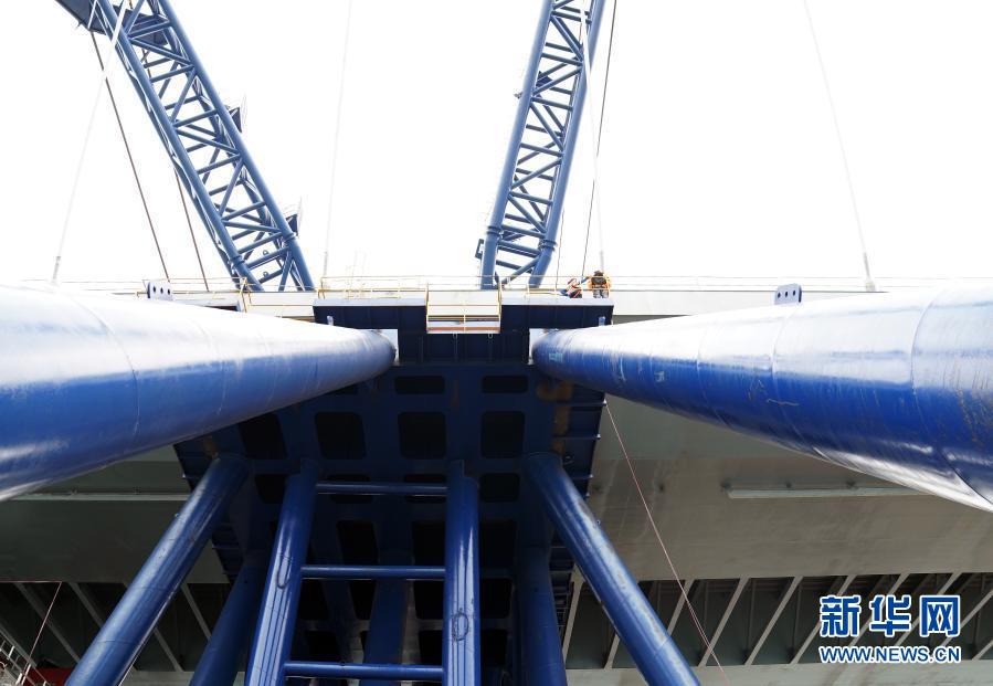 “冒出來(lái)”的并不是一座完整的大橋,而是一段跨徑長(zhǎng)達(dá)200米的雙拱鋼橋,在海面中央兀然矗立?!斑@是我們大橋工程最核心的主橋部分,技術(shù)難度最大,對(duì)整個(gè)項(xiàng)目有里程碑的意義?!背薪▎挝恢袊?guó)路橋工程有限公司董事、項(xiàng)目總指揮闞軍說(shuō)。