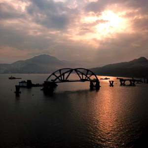 2月25日傍晚,將軍澳海灣斜陽(yáng)夕照,波光粼粼。遠(yuǎn)遠(yuǎn)看去,一艘巨大的駁船“馱”著一座雙拱鋼橋靜靜地停泊在海面中間。