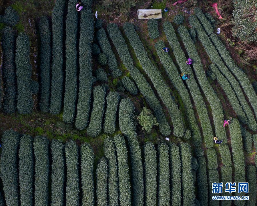 3月12日,在位于杭州市西湖風(fēng)景名勝區(qū)滿覺(jué)隴村白鶴峰的西湖龍井茶葉基地,茶農(nóng)在采摘西湖龍井頭茶(無(wú)人機(jī)照片)。