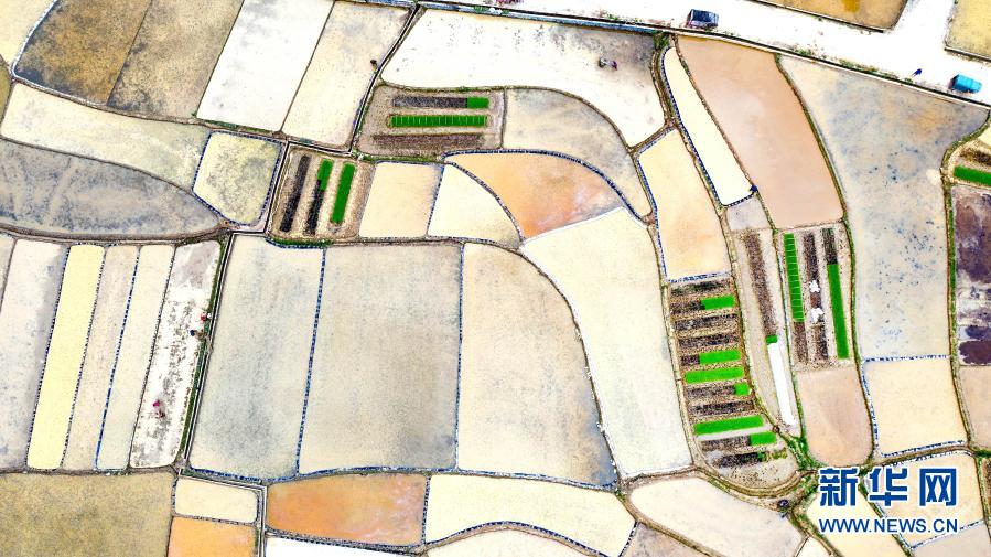 3月24日,廣西河池市東蘭縣武篆鎮(zhèn)色故村農(nóng)民在田間勞作(無人機(jī)照片)。