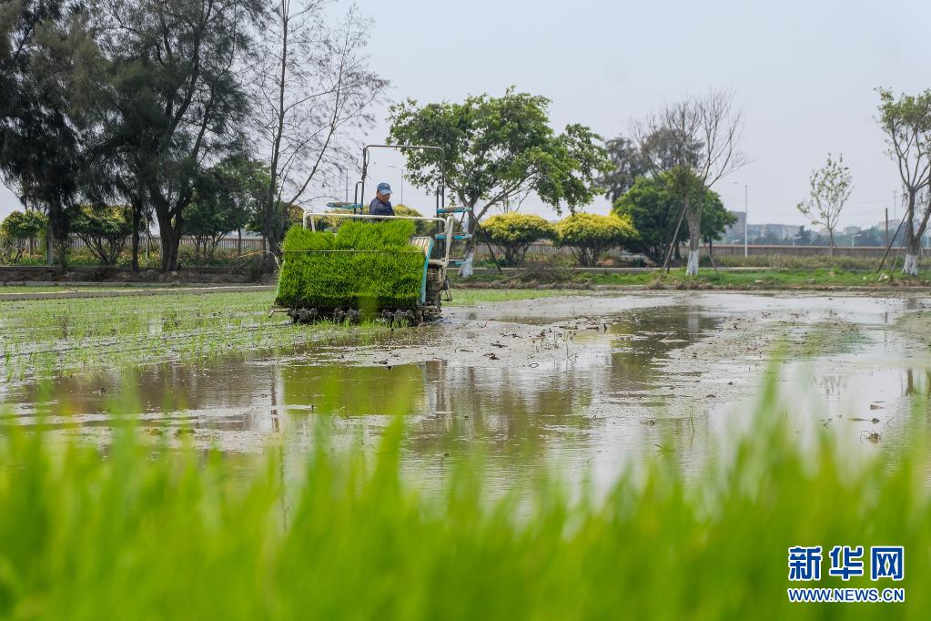 4月5日,在福建省石獅市科技種子試驗(yàn)場(chǎng),農(nóng)民駕駛插秧機(jī)在田里插秧。