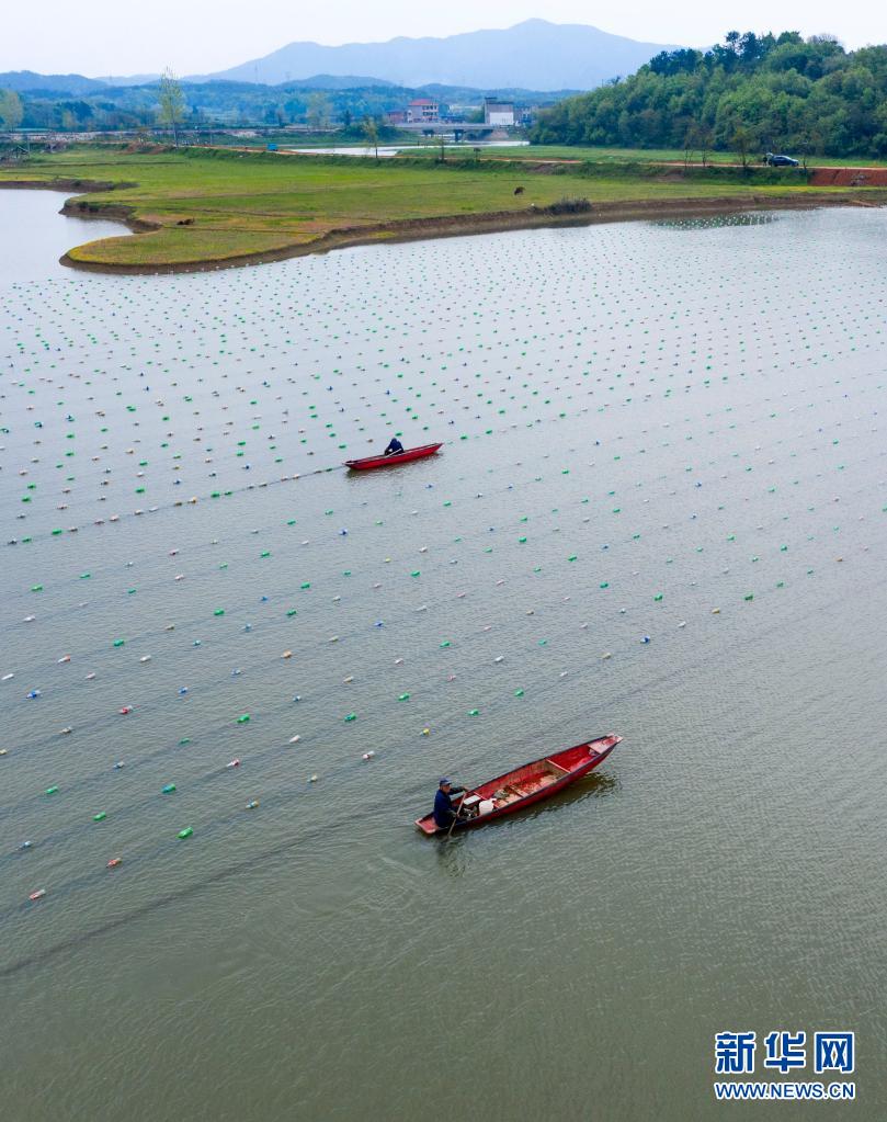 4月6日,在江西省九江市都昌縣新妙湖畔珍珠養(yǎng)殖基地,蚌農(nóng)在投放珍珠蚌(無人機照片)。