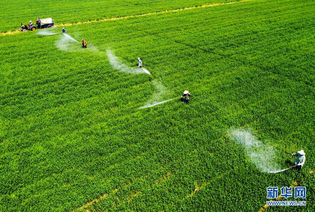 4月6日,安徽省合肥市廬江縣白湖鎮(zhèn)白湖社區(qū),農(nóng)民在田間進行小麥赤霉病防治作業(yè)。