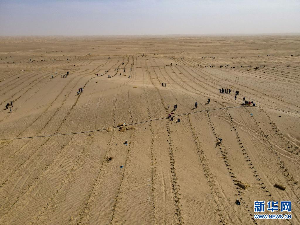 這是在新疆且末縣城不遠處的塔克拉瑪干沙漠內(nèi)植樹的群眾(3月28日攝,無人機照片)。新華社記者 高晗 攝