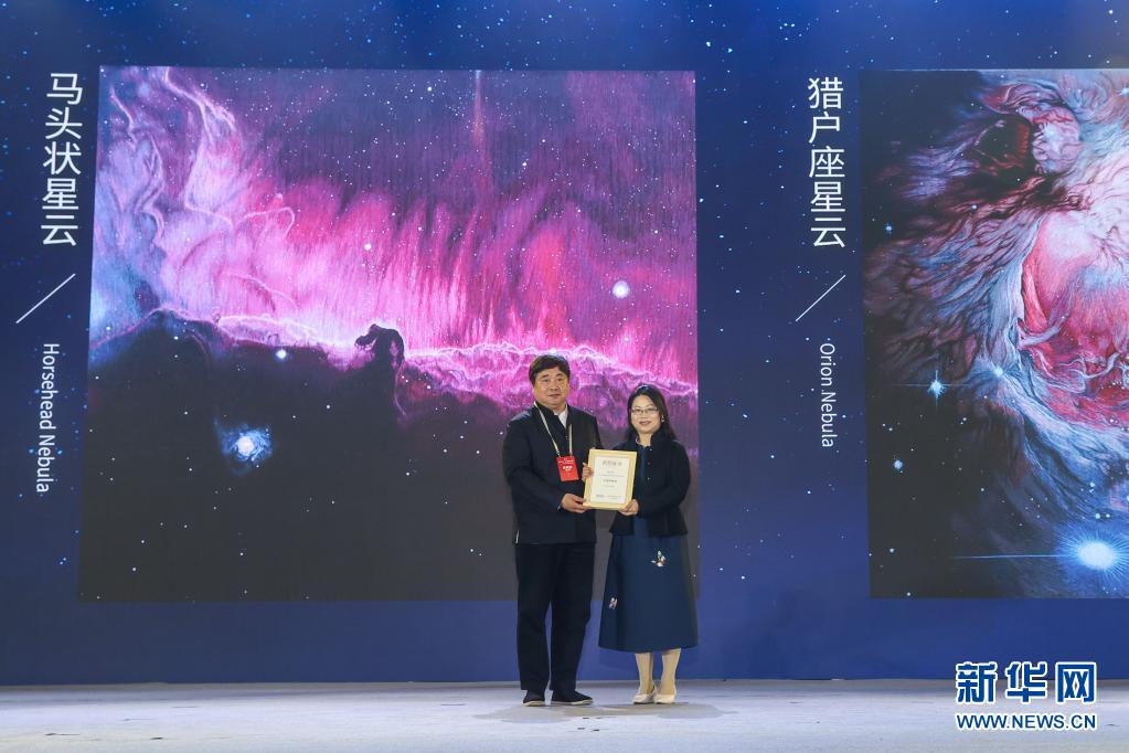 4月24日,在江蘇南京中國航天日主場活動現(xiàn)場,陳英華(右)的“星空”系列蘇繡作品獲得太空探索與藝術創(chuàng)想大賽特別獎。新華社發(fā)(崔曉 攝)