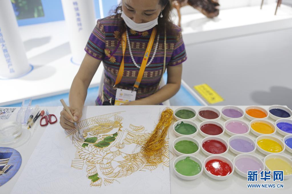 5月8日,一名參展商在消博會(huì)現(xiàn)場(chǎng)制作景泰藍(lán)畫。新華社記者 丁洪法 攝
