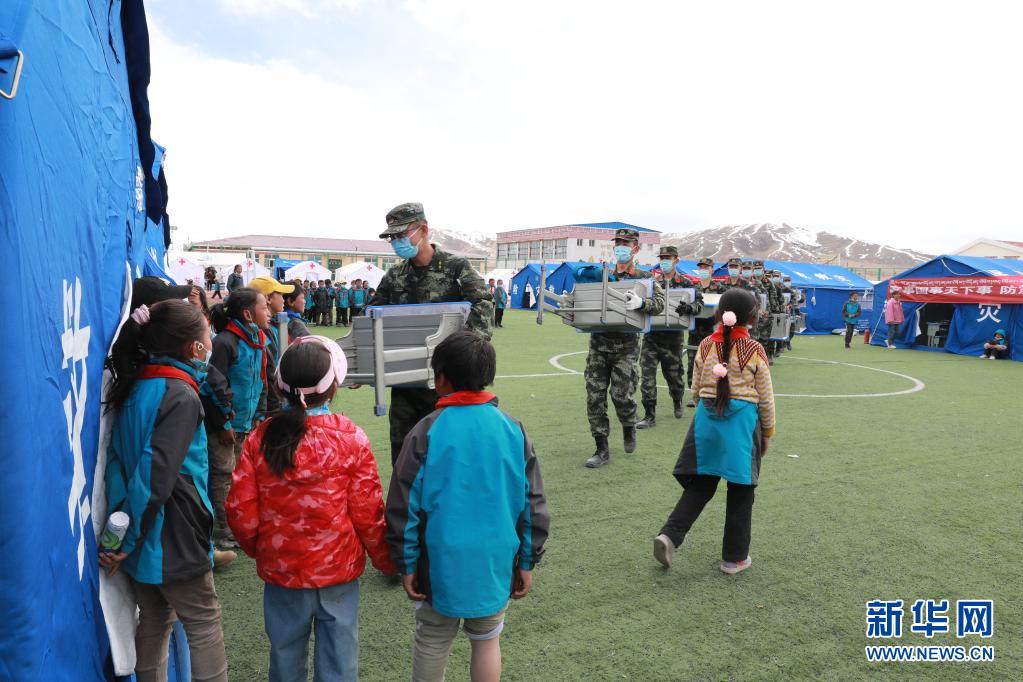 5月24日,武警青海總隊(duì)果洛支隊(duì)機(jī)動(dòng)大隊(duì)排長(zhǎng)張國(guó)睿(前一)和戰(zhàn)友為花石峽鎮(zhèn)藏文中心寄宿制小學(xué)的帳篷教室搬運(yùn)課桌。新華社記者 劉芳 攝