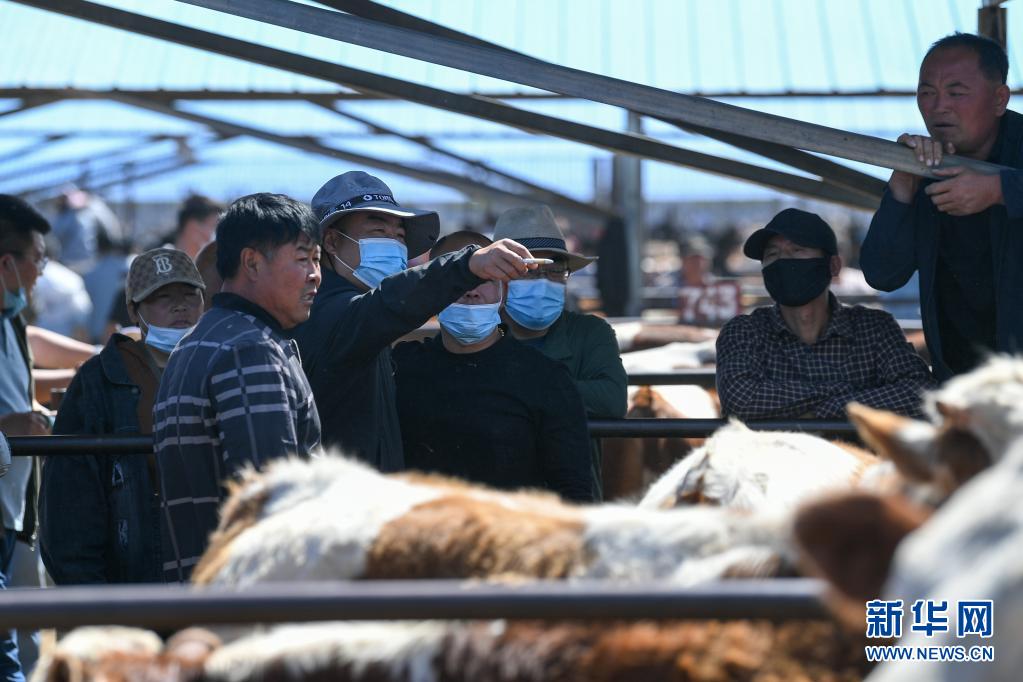 6月1日,交易者在開魯牛市交易攤位看牛詢價。