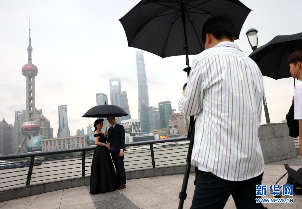 6月10日,游客在雨中的上海外灘拍攝藝術照片。