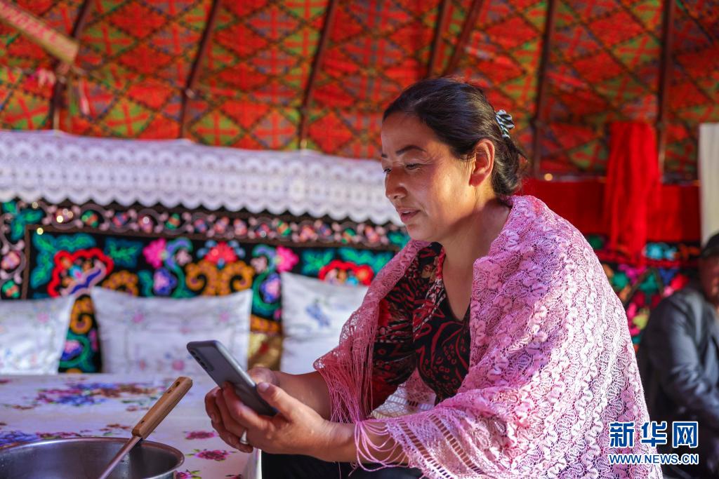 在新疆裕民縣巴爾魯克山區(qū)夏牧場上,一名開辦牧家樂的牧民在氈房內(nèi)用手機上網(wǎng)(6月16日攝)。