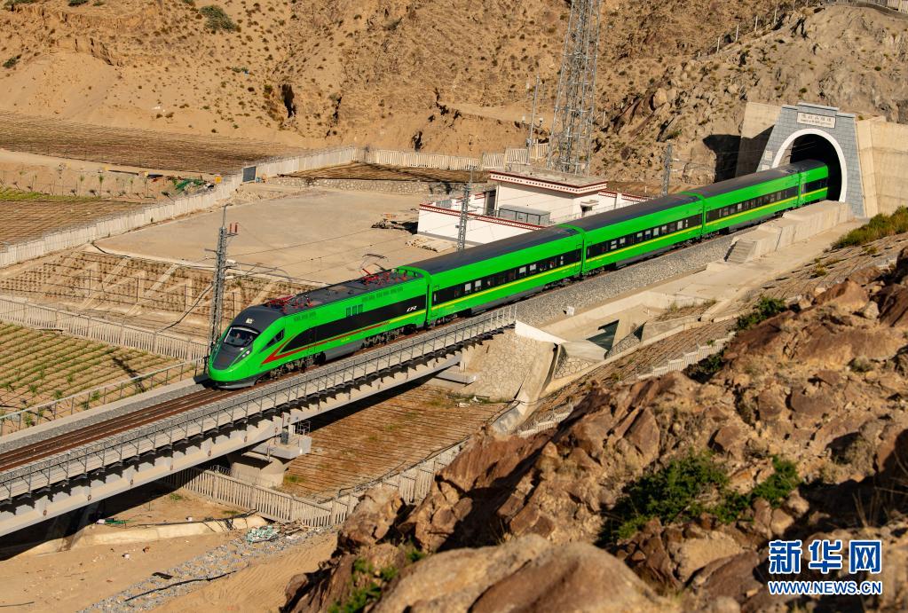 試運(yùn)行的復(fù)興號(hào)列車(chē)駛出拉林鐵路的嘎拉山隧道(6月16日攝)。