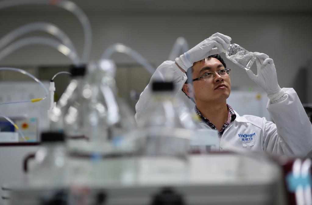 2017年5月9日,江蘇蘇州,在信達(dá)生物制藥(蘇州)有限公司研發(fā)實(shí)驗(yàn)室,一名工程師在觀察藥物中間產(chǎn)品外觀。 新華社記者 李響 攝