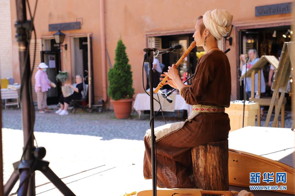 7月1日,一名身著中世紀(jì)風(fēng)格服裝的表演者在芬蘭圖爾庫(kù)舉行的“中世紀(jì)市集”上演奏。