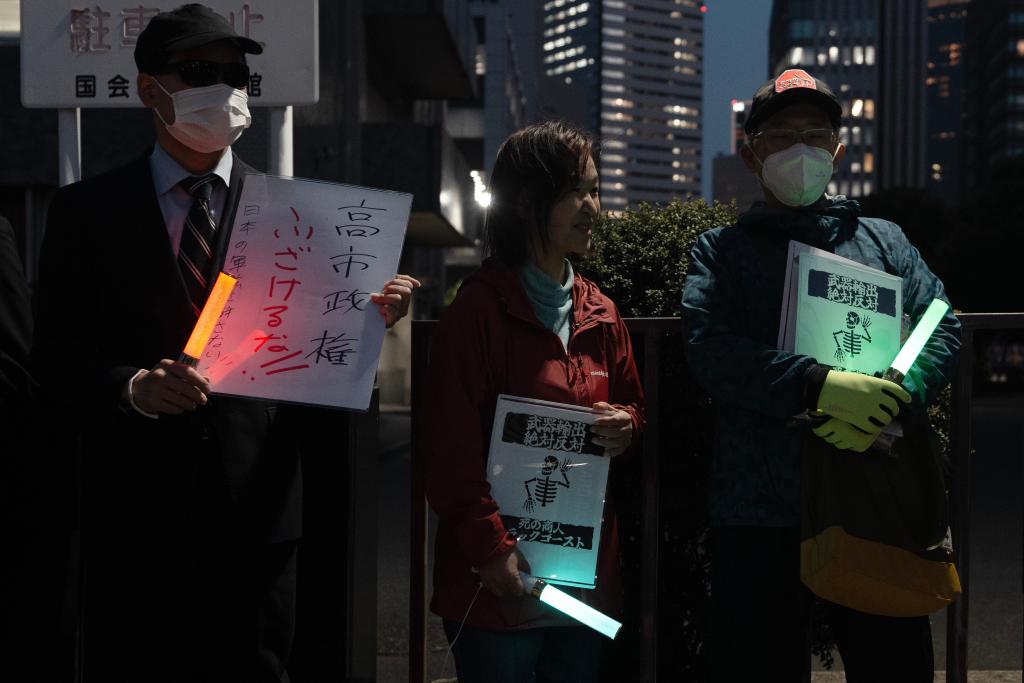 针对高市早苗政府计划近期修改“防卫装备转移三原则”及其运用指南,日本民众16日晚在东京的首相官邸前举行抗议集会,反对解禁杀伤性武器出口。新华社记者 贾浩成 摄