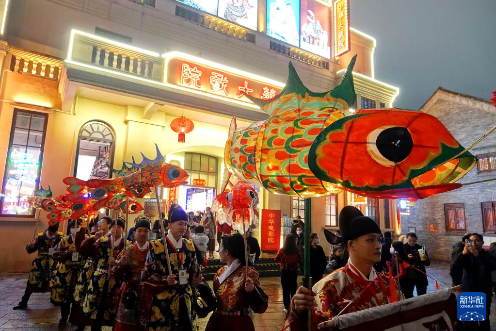 2月5日,在广西南宁市三街两巷历史文化街区,人们手持鲤鱼花灯巡游。