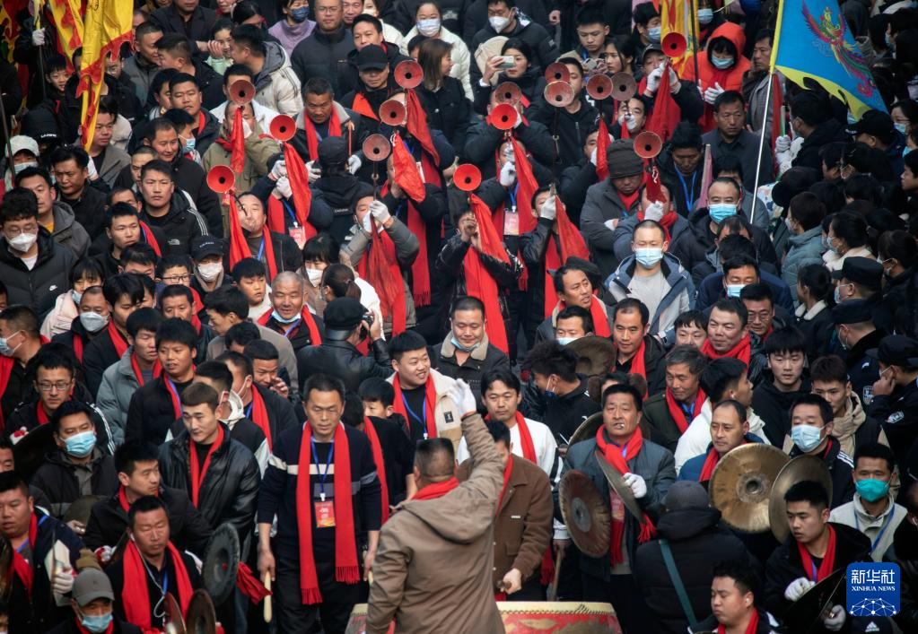 2月6日,社火团队的演员在庙会上表演舞狮(无人机照片)。