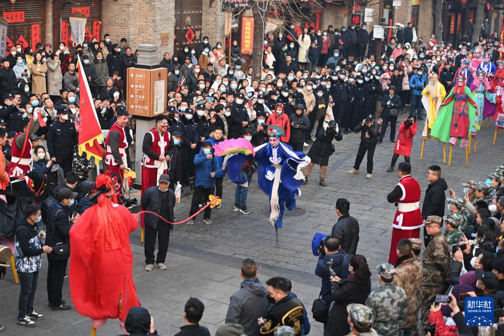 2月6日,社火团队的演员在庙会上表演(无人机照片)。