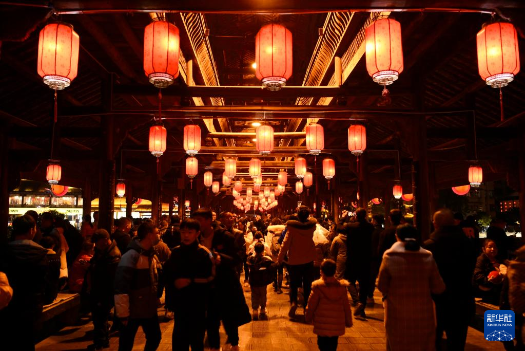 2月5日晚,湖北省宣恩县仙山贡水旅游区的风雨桥上人潮涌动。
