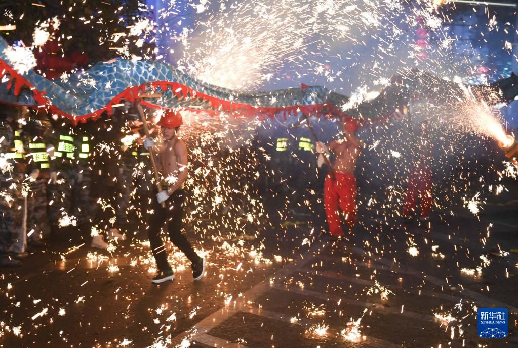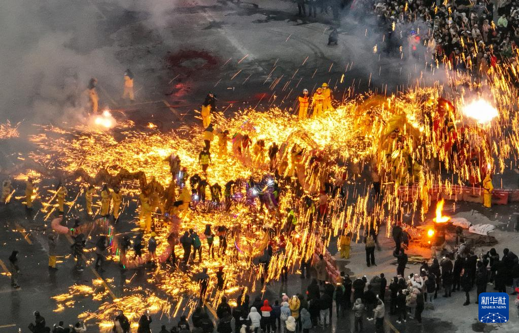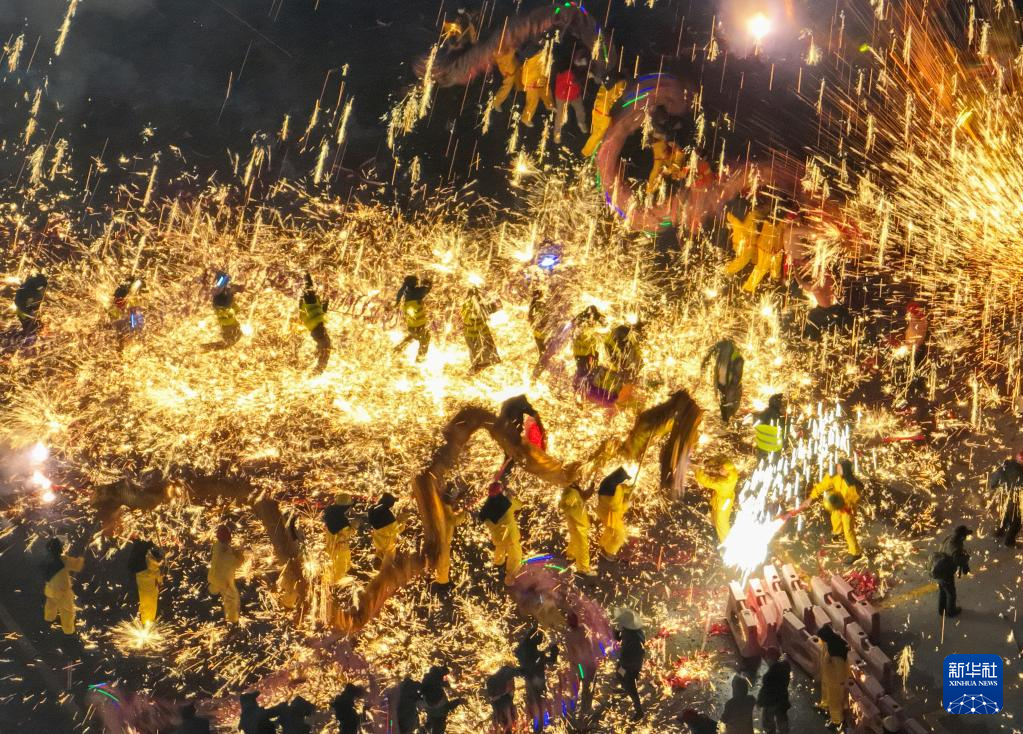 2月5日,在贵州省遵义市新蒲新区新蒲街道中桥村,人们在铁花中舞龙(无人机照片)。