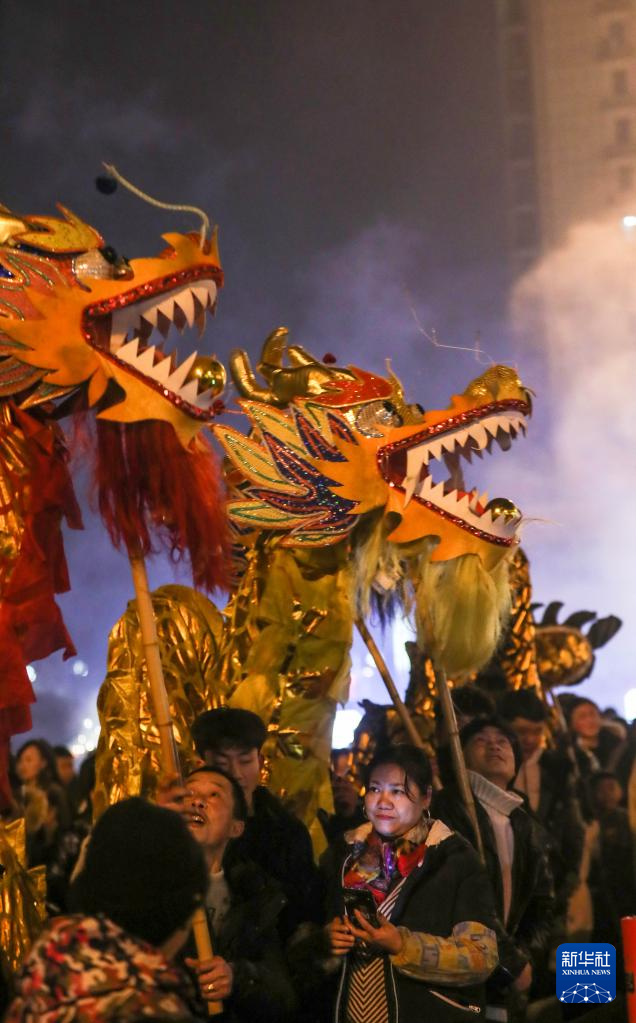 2月5日晚,人们在贵州省玉屏侗族自治县舞阳广场舞龙。