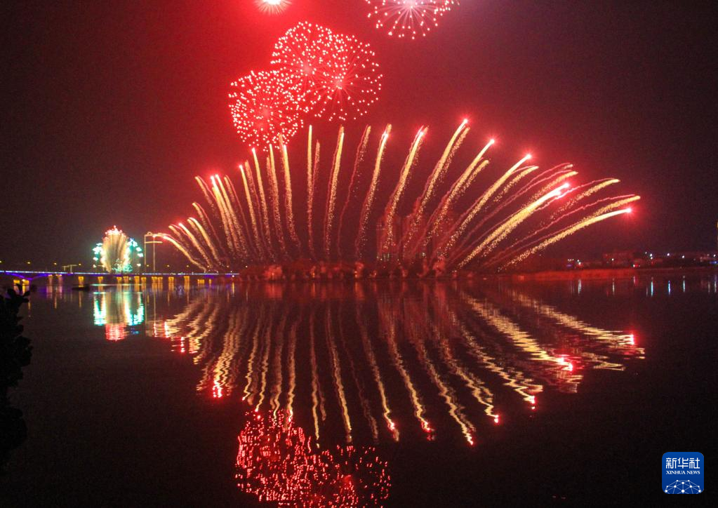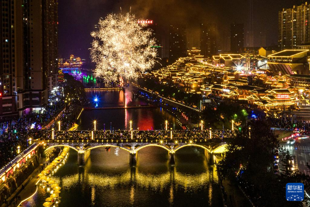 2月5日,河南省南阳市中心城区白河上空,璀璨夺目的烟花在高空绚丽绽放,吸引许多游客、市民观赏。