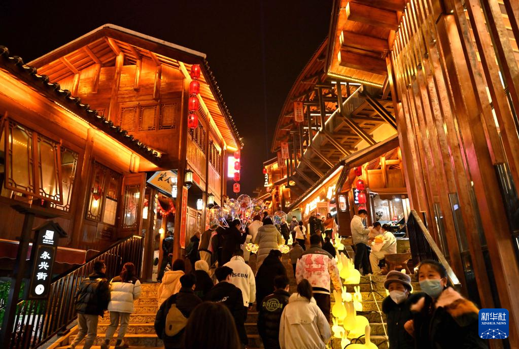 2月5日晚,湖北省宣恩县城兴隆老街人潮涌动。