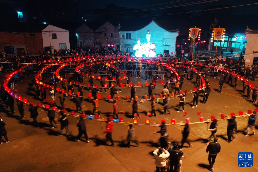 2月5日晚,浙江省东阳市南马镇防军村的村民们在迎龙灯闹元宵(无人机照片)。