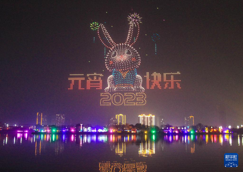 2月5日,河南省南阳市中心城区,游客在观看无人机编队在夜空中组成的造型。