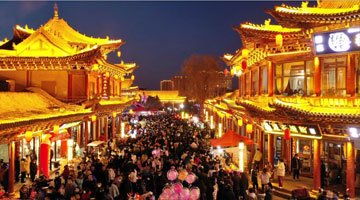 2月9日,在孔子博物馆举行的山东文物精品展上,参观者在观看山东省文物考古研究院收藏的大汶口文化八角星纹彩陶豆。