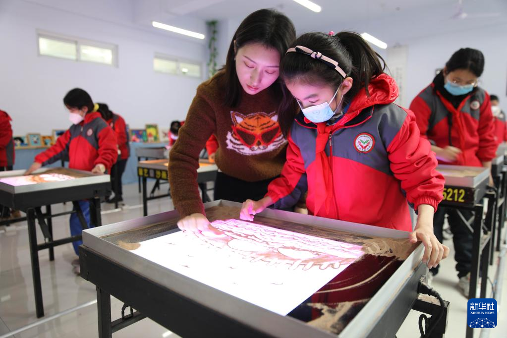 2月14日,在承德市双桥区石洞子沟小学,学生在老师的指导下制作沙画。