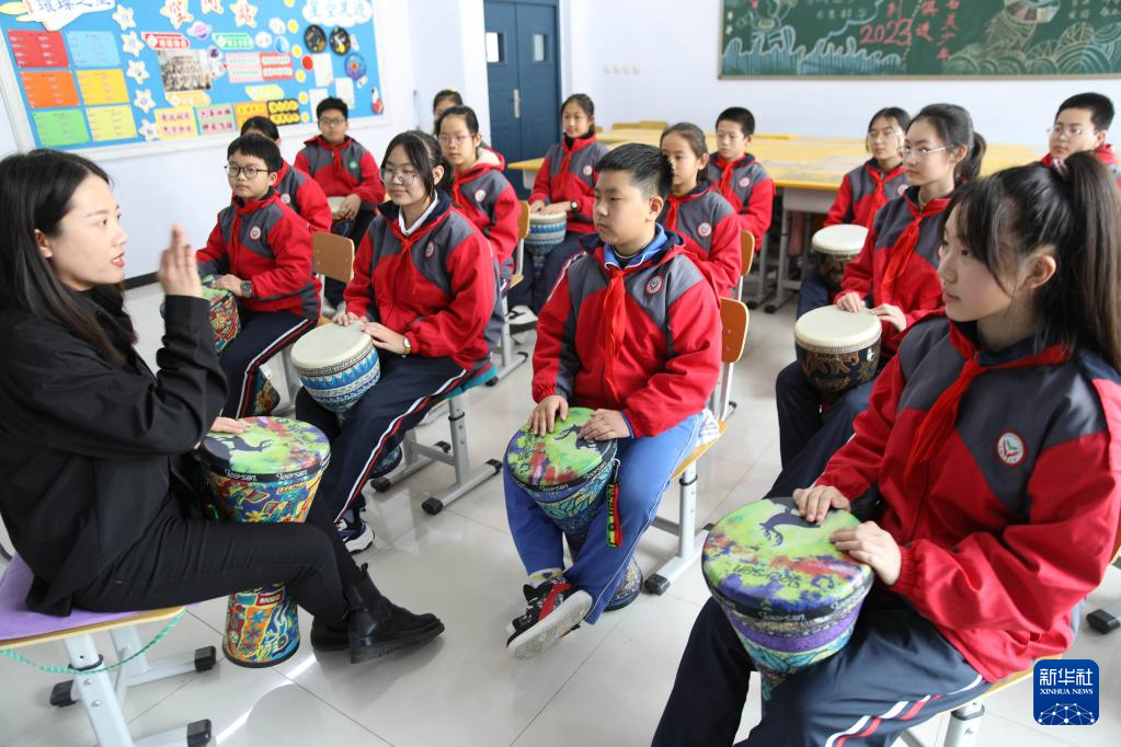 2月14日,在承德市双桥区石洞子沟小学,学生在老师的指导下练习非洲鼓。