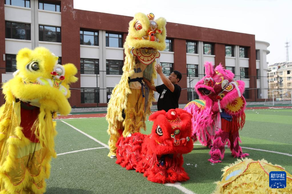 2月14日,在承德市双桥区石洞子沟小学,学生在老师的指导下练习舞狮。