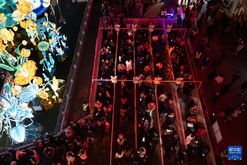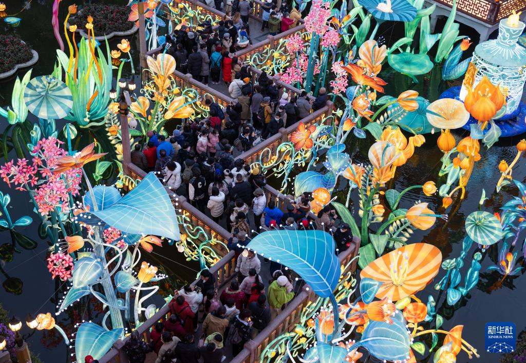 2月15日,市民和游客在上海豫园九曲桥赏灯。