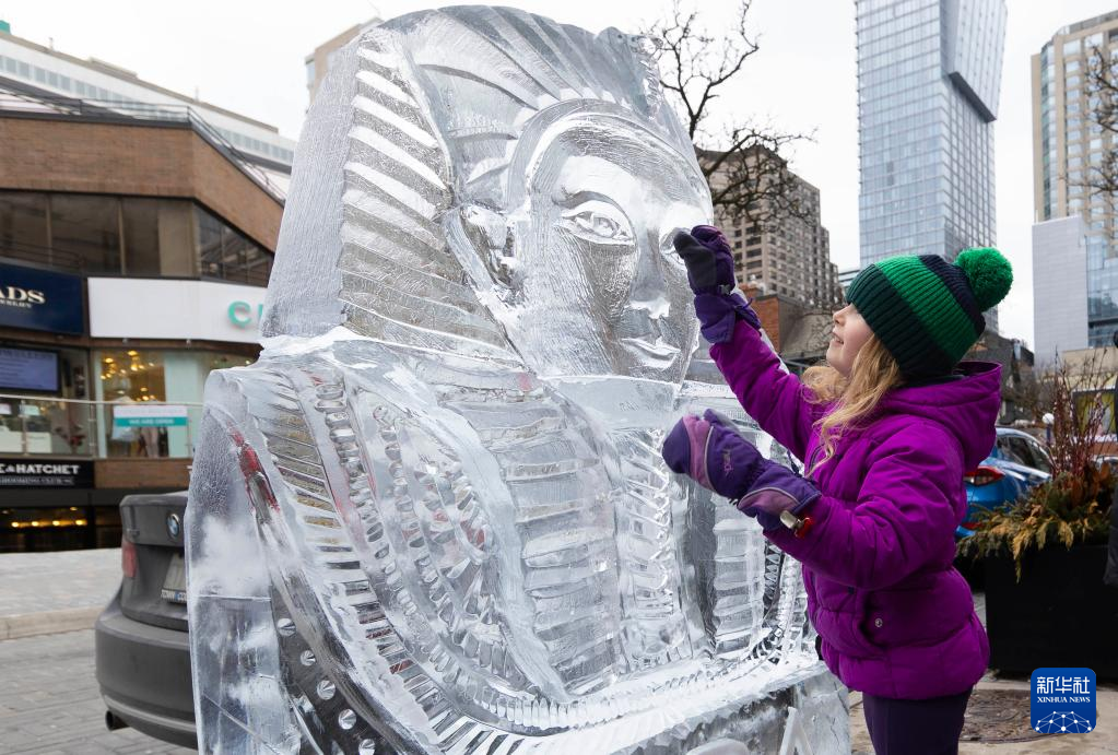 2月18日,一名小女孩在加拿大多伦多街头观赏冰雕作品。