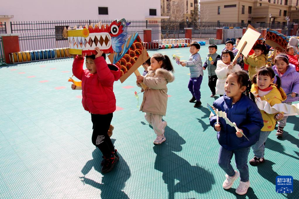 2月20日,山东省青岛西海岸新区胶南中心幼儿园的小朋友在“二月二 龙抬头”主题活动中用自制的道具舞龙。