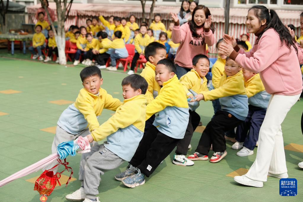 2月20日,江西省吉安市吉州区保育院的孩子们在“二月二 龙抬头”活动上参加拔河比赛。
