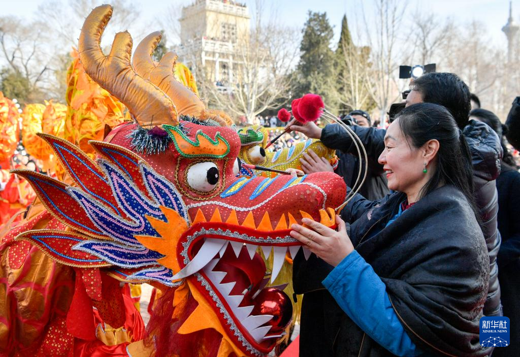 2月21日,在天津市水上公园,嘉宾为舞龙点睛。
