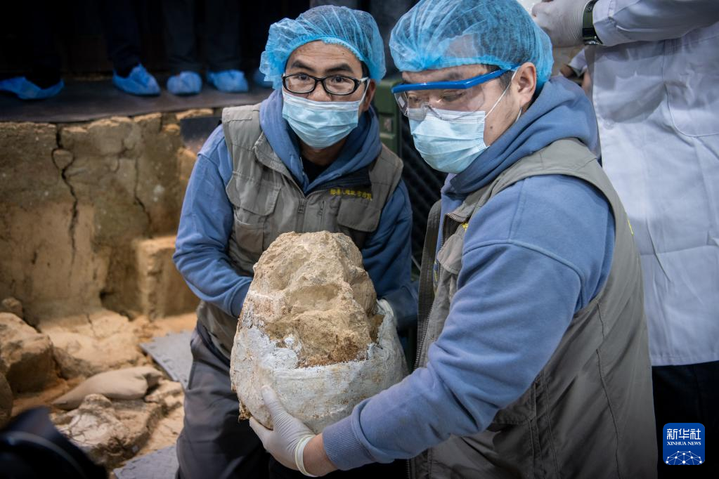 考古队员展示提取离土的头骨化石(资料照片)。