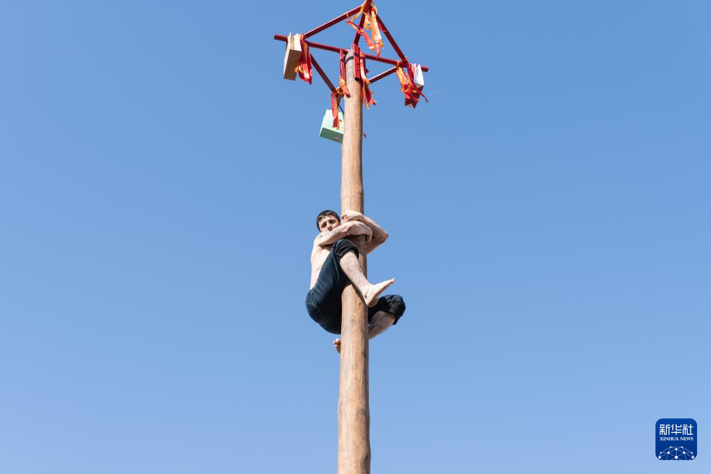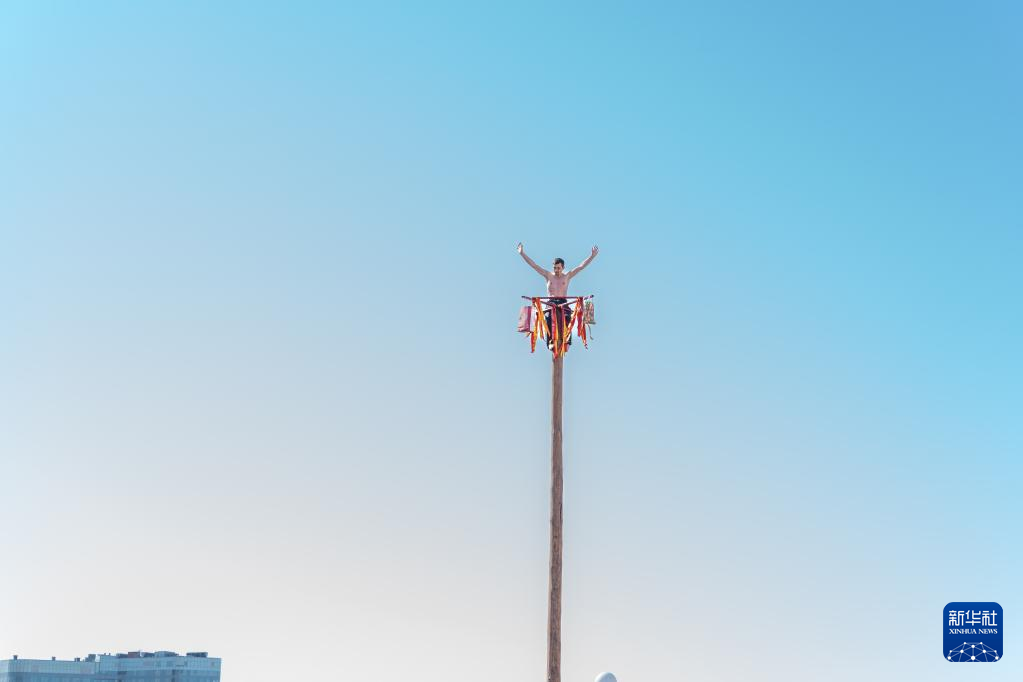 2月26日,一名男子在俄罗斯符拉迪沃斯托克的庆祝活动上成功爬到了木杆的顶端。