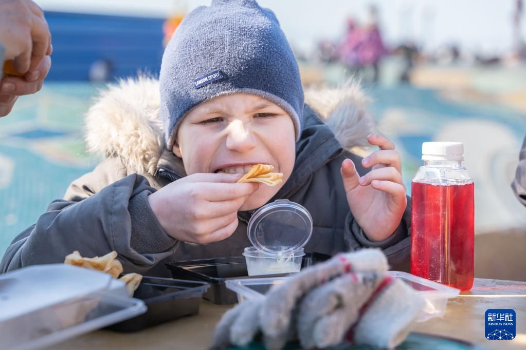 2月26日,一名男孩在俄罗斯符拉迪沃斯托克的庆祝活动上吃俄式薄饼。