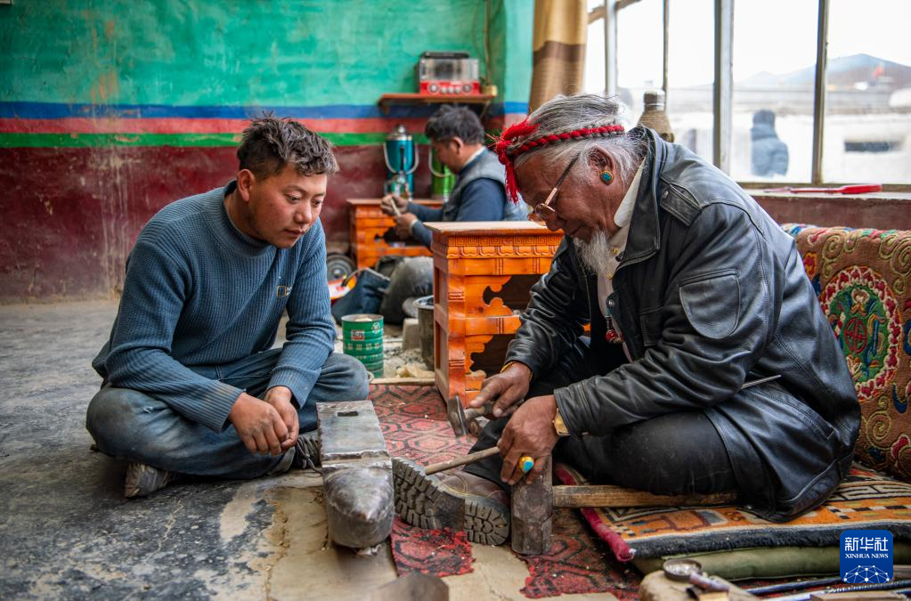 在拉孜县柳乡孜龙村,次旦旺加(右)在指导孙子制作藏刀(3月17日摄)。