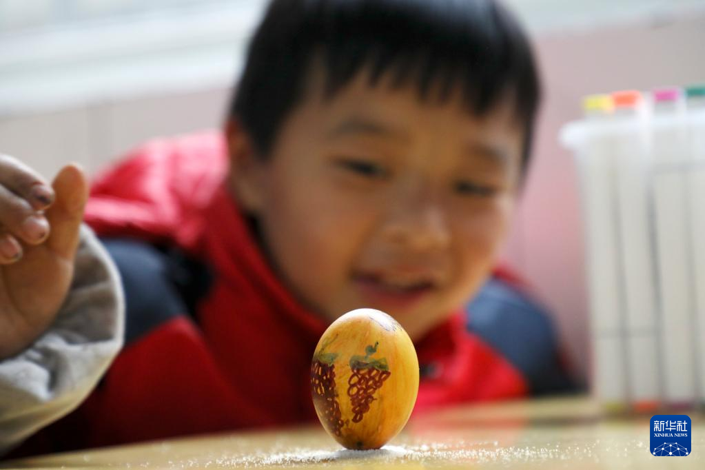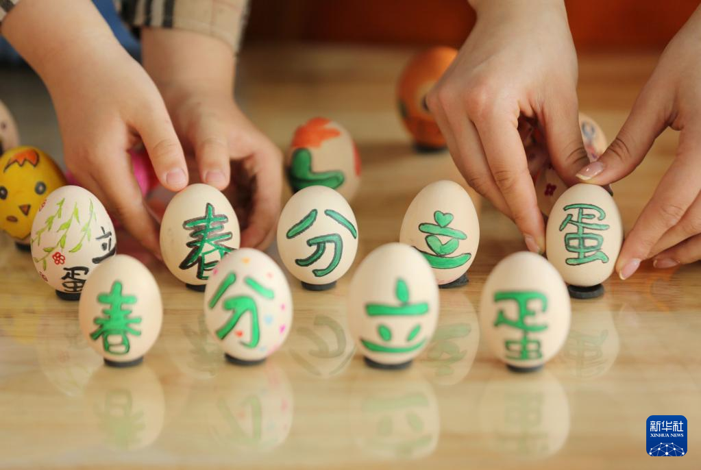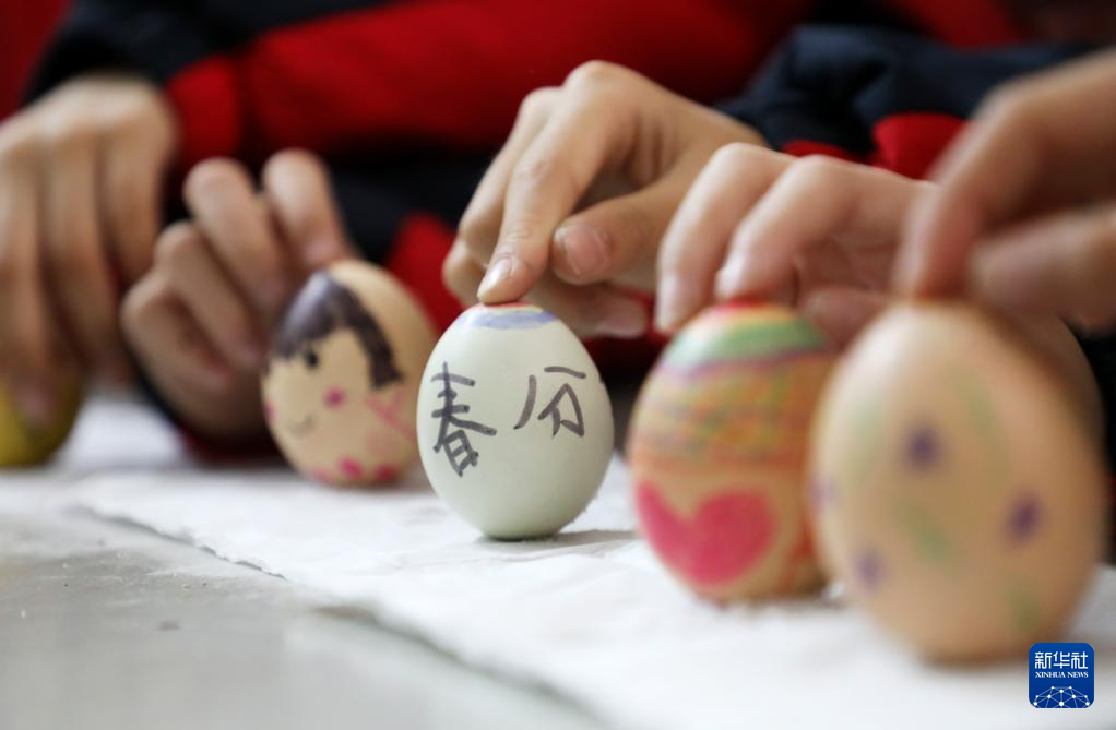3月20日,在浙江省金华市婺城区红湖路小学,学生体验立蛋民俗。