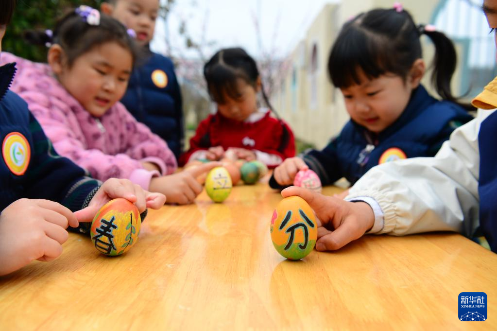 3月20日,在山东省临沂市沂南县第二实验幼儿园,小朋友在体验“立蛋”。