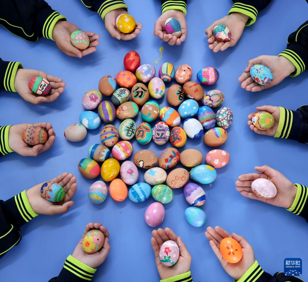 3月20日,在山东省枣庄市江山实验学校,小学生们在展示绘制的“彩蛋”。