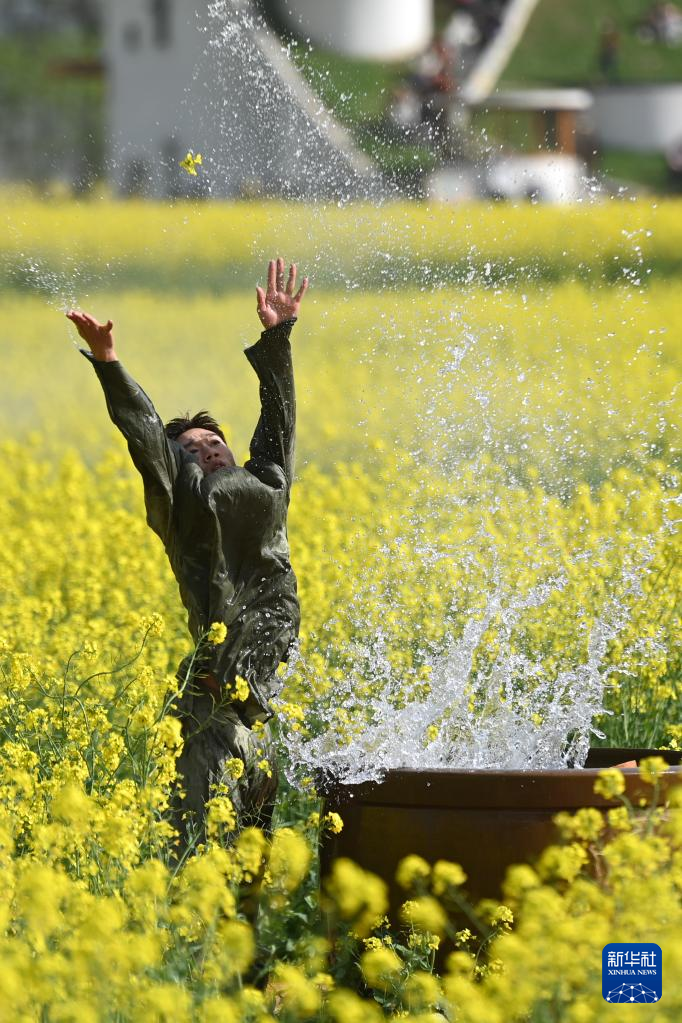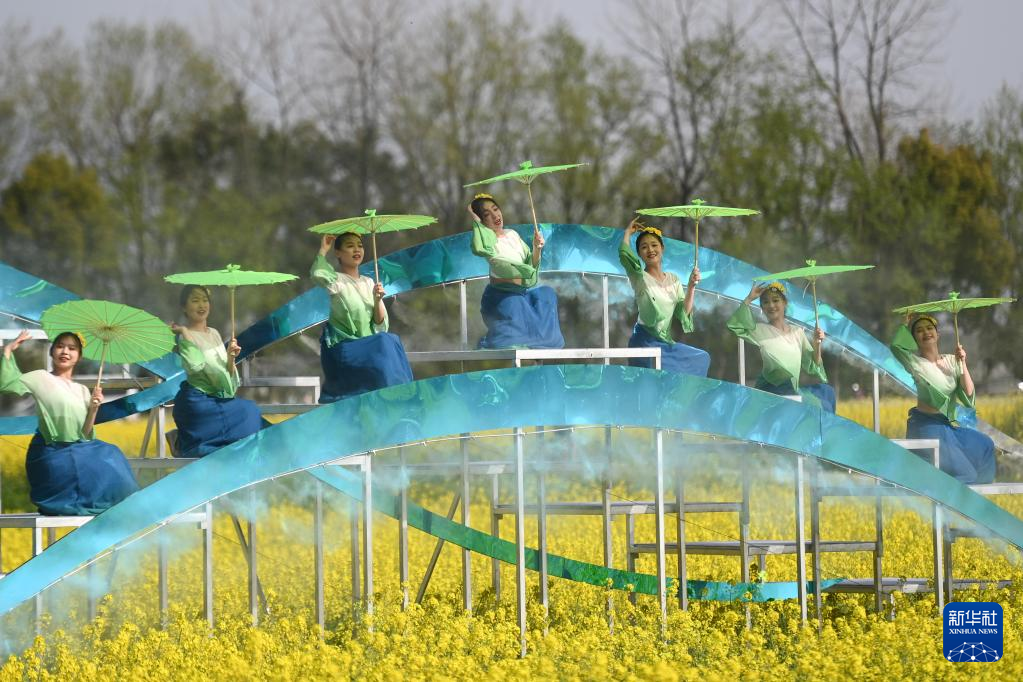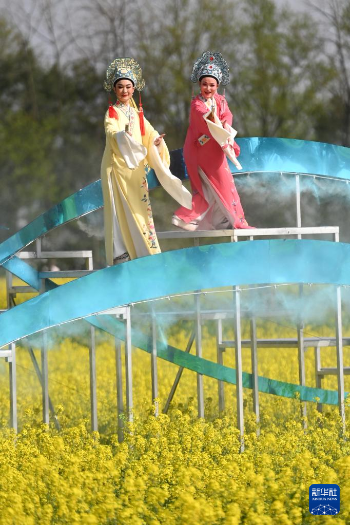 3月26日,演员在梅蓉村的油菜花田里表演。