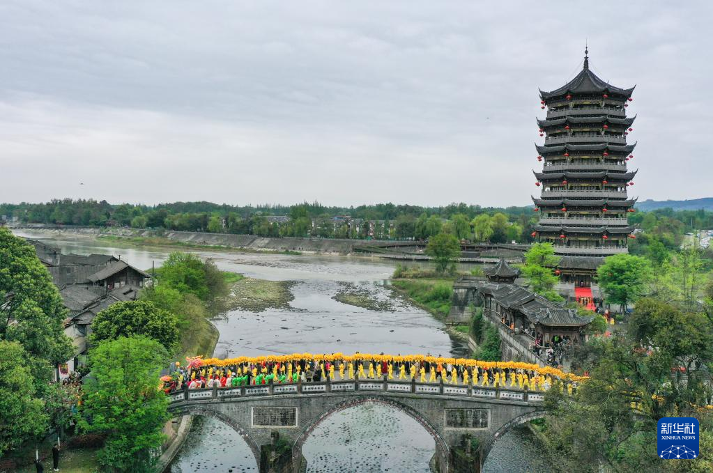 4月5日,游客在成都崇州市元通古镇观看“汇江老龙”巡游表演。