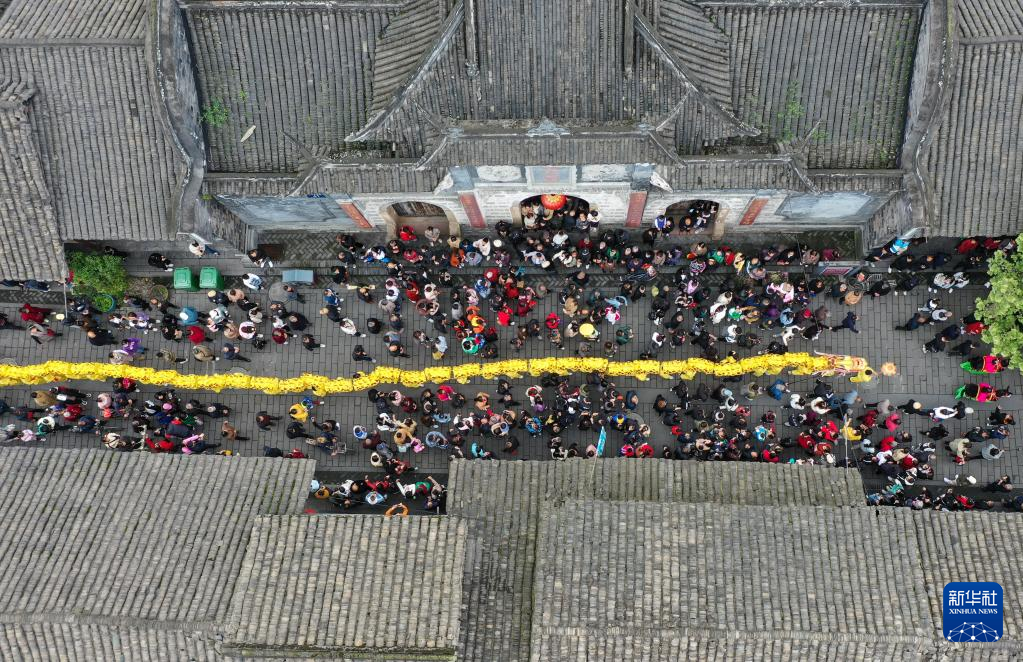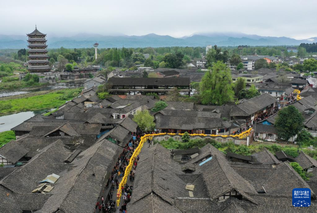 当日,崇州元通清明春台会在四川成都崇州市元通古镇拉开帷幕。由269人手举269截龙身汇聚成的“汇江老龙”,在古街上巡游。