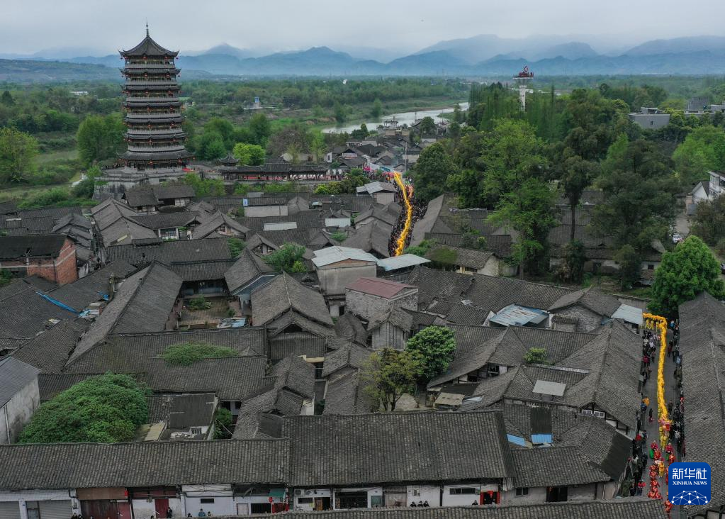 这是4月5日在成都崇州市元通古镇拍摄的“汇江老龙”巡游队伍(无人机照片)。